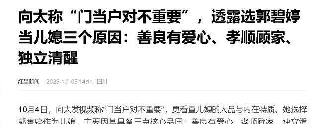 在豪门这个复杂的大家庭里,向太这样做可能是提醒郭碧婷,即使嫁入向家,也不能完全随心所欲。 10月初,向太在一个公开视频里提起了儿媳妇郭碧婷长期住在台北的事情,语气里满是“理解”。 她说是因为郭碧婷的父亲病重需要照顾,所以她才选择留在娘家,这番话一开始得到了很多好评,大家都说向太很通情达理。